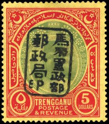 1942 Trengganu $5 green and red/yellow, chop 'E' in black, large part o.g. Much fresher than usually found with excellent colour. Popular and Scarce. SG J115