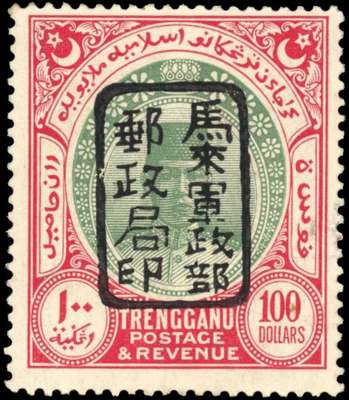 Malaya Japanese Occupation 1942 Trengganu $100 green and scarlet, chop 'F' in black SG J118