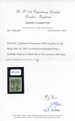 1942 (3 Apr) Straits 3c green, chop 'A' in black, fine large part o.g. Very scarce. BPA cert (2024). SG J149a cat £600