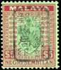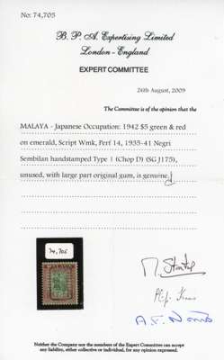 1942 (3 Apr) Negri Sembilan $5 green and red on emerald paper, chop 'D' in black, fine large part o.g. Very scarce. BPA Certificate (2009). SG J175 cat £950