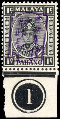 1942 (3 Apr) Pahang 1c black, chop 'A' in violet, lower marginal showing plate number ‘1’, fine unmounted o.g. Very scarce, and highly desirable in this form and condition. SG J176b, cat £450+