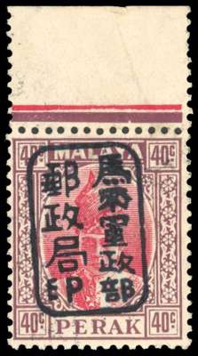 1942 (3 Apr) Perak 40c scarlet and dull purple, chop 'E' in black, brilliant large part o.g. Rare in unused condition, especially in this choice quality. SG J201 cat £1,000