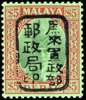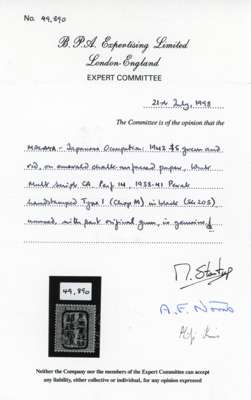 1942 (3 Apr) Perak $5 green and red/emerald, chop "M" (broken state) in black, large part o.g. Very scarce. BPA cert (1998). SG J205 cat £800