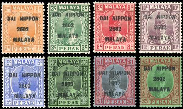 1942 Perak 2c to $5 green and red/emerald, complete set of 8 with type 16 ‘DAI NIPPON/2602/MALAYA’ opt, fresh large part o.g. Well above average, the key $1 very lightly mounted and signed Rowell. SG J246/53
