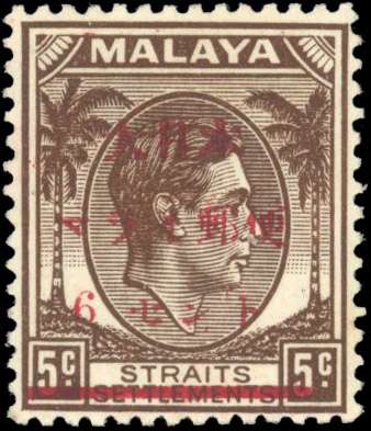 1942-4 6c Red Cross surcharge on Straits 5c brown, large part o.g. A rarity which was prepared for use but not issued. See footnote after SG J317. A lovely example. BPA cert (2024)