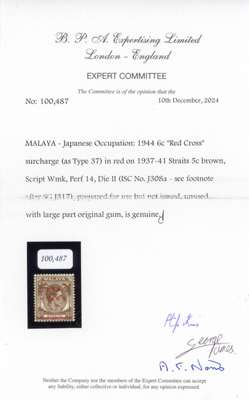 Malaya Japanese Occupation 1942-4 Unissued 6c Red Cross surcharge on Straits 5c brown BPA cert