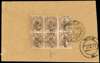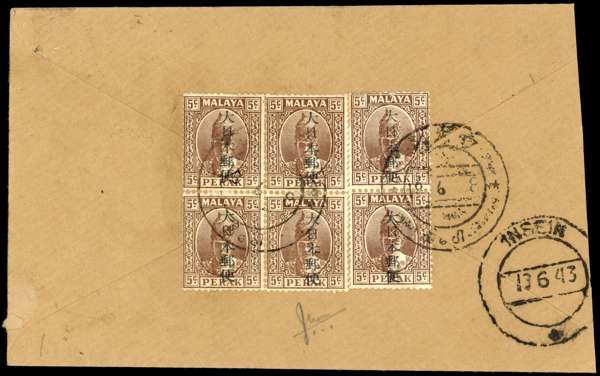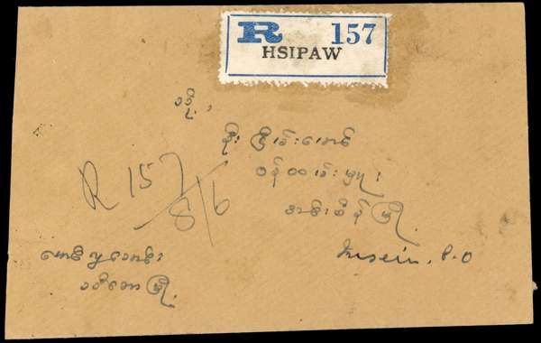 1944 envelope registered from Hsipaw to Insein bearing on reverse, Perak Kanji 5c. block of four and vertical pair clearly tied by Japanese/Burmese Hsipaw c.d.s. and bearing Hsipaw registration label on face. Envelope slightly reduced at right, not detracting from this extremely rare usage in the Shan States under Japanese/Thai occupation.