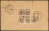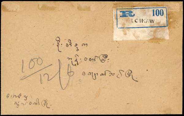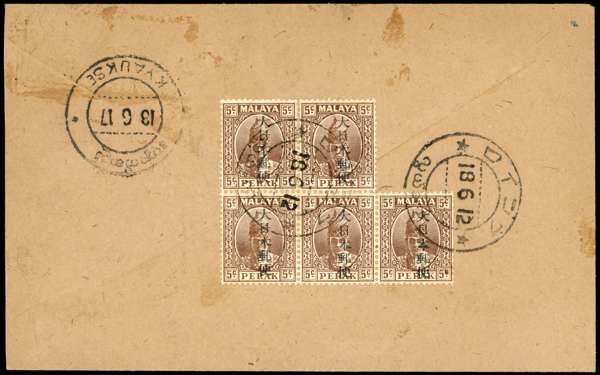 1944 envelope registered from Loikaw to Kyaukse, bearing registration label on face and on reverse, Perak Kanji 5c block of five, clearly tied by Japanese/Burmese dual language cds, with arrival cds five days after sending. Very Rare usage in Japanese/Thai occupied Shan States.
