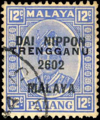 1944 Pahang 12c bright ultramarine with Dai Nippon overprint, with further TRENGGANU overprint Type TT1, cancelled with part Kuala Trengganu CDS. One slightly short perf at base, otherwise fine. Less than 50 are recorded. SG TT4, £425