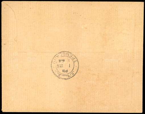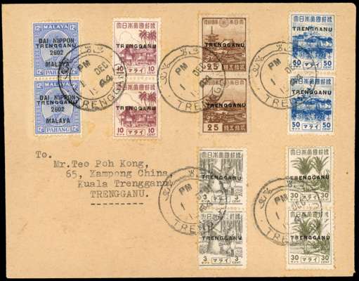 1944 (1 DEC) locally addressed cover bearing six vertical pairs, cancelled by five strikes of Kuala Trengganu CDS, the earliest known date. The stamps are Pahang 12c, Pictorial 3c, 10c, 30c and 50c and Japan 25s. A great rarity, with just ten known used examples of the 10c, and around thirty of the 50c. A little toning. SG TT4, 21, 24, 26-7, 33, catalogued £6500 as stamps