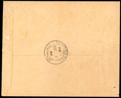 1944 (1 DEC) locally addressed envelope bearing various issues in pairs or two examples, all overprinted TRENGGANU Type TT1, each pair cancelled Kuala Trengganu CDS. The stamps are Pahang Dai Nippon SG TT4, Selangor Kanji SG TT15, Pictorial 15c, 30c pairs and 70c two examples SG TT25-6, 28, and Japan 25s and 30s SG TT33-4. A little discolouration and faint foxing around perfs, and the right 70c with a nick at top; the envelope a little damaged on reverse; still a rare and spectacular cover, with six used 70c known. Catalogued as stamps £7650