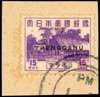 1944 Pictorial 15c violet overprinted TRENGGANU Type TT1, used on piece with part Kuala Trengganu CDS of 1 DEC, the earliest recorded date. Around 50 used known. A little discoloured at left, and some faint foxing. SG TT25, £375