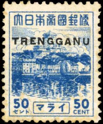 1944 50c blue Pictorial overprinted TRENGGANU Type TT1, very lightly used with part Kuala Trengganu CDS. Faint foxing, still of good appearance. SG TT27, £650