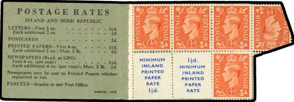 1951 ½d Pale orange. Unused o.g. part mis-cut booklet pane of five with a partial tête-bêche pair at right due to a paper fold before the cutting process, resulting in a complete tête-bêche pair with the aforementioned paper fold through the left hand stamp. A few issues such as creases and perf separation, still a visually appealing variety and one of the great rarities of GB philately. SG503b. Spec. Q3a. Cat £20,000 as a complete tête-bêche pair.