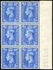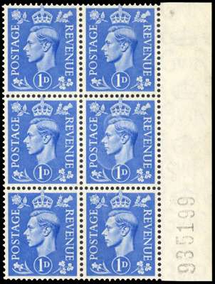 1951 1d Light ultramarine (SG504var). Superb unmounted o.g. right-hand marginal block of six showing sheet number ‘935199’ in sheet margin with ‘Keyhole’ flaw (Cyl. 192 no dot, R 6/12). Rare variety. Spec. Q6d. SG504var.