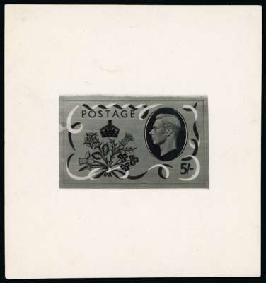 1951 5s Festival High Value. An attractive photographic proof (72 x 76mm) of an unaccepted design by Mary Adshead (designer of accepted design) featuring the four emblems of individual nations of the United Kingdom (Rose, Thistle, Daffodil and Shamrock) as seen on the George VI definitives, "Arms" High Value and "Victory" sets showing solid background to King's head. One of four designs submitted by this artist. Ex Mary Adshead estate. Rare. SG510.