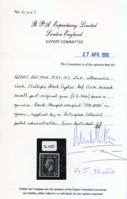 1937 2½d Ultramarine (SG466var). Unused small part o.g. example overprinted ‘SPECIMEN’ in green, applied by the Portuguese Colonial Postal Administration. Very scarce. 1990 BPA Cert.