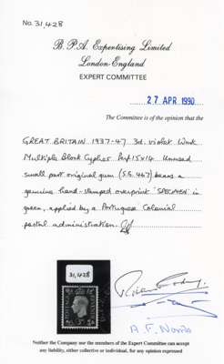 1937 3d Violet (SG467var). Unused small part o.g. example overprinted ‘SPECIMEN’ in green, applied by the Portuguese Colonial Postal Administration. Very scarce. 1990 BPA Cert.