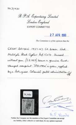 1938 5d Brown (SG469var). Unused example overprinted ‘SPECIMEN’ in green, applied by the Portuguese Colonial Postal Administration. Very scarce. 1990 BPA Cert.