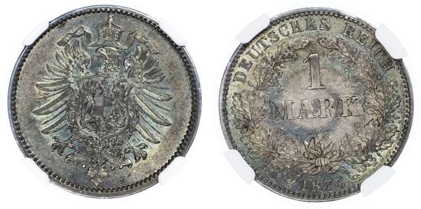 Germany. Empire AR 1 Mark. 1875J. J J below Imperial eagle / DEUTSCHES REICH, denomination in wreath, date below. KM 7. 5.56g, 24mm, 12h.
