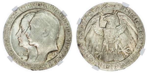"Germany,, States, Prussia. William II AR 3 Marks, Berlin University. 1910A. FRIEDRICH WILHELM III·WILHELM II, *UNIVERSITÄT BERLIN*