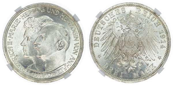 Germany, States. Anhalt-Dessau AR 3 Marks, Silver Wedding. 1914A.