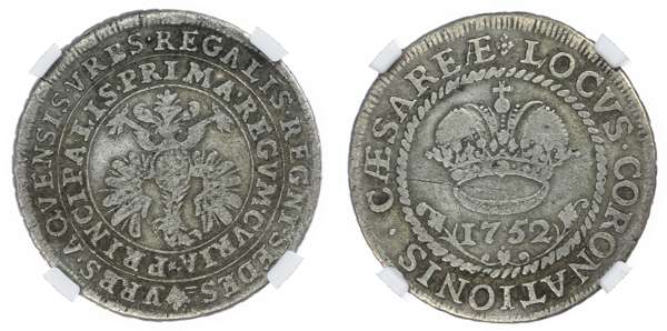 Germany, States. Aachen AR 16 Marck. 1752. VRBS·AQVENSIS·VRBS·REGALIS·REGNI·SEDES, PRICIPALIS·PRIMA·REGVM·CVRIA·* Eagle with 16 on breast, double legends / LOCUS·CORONATIONIS·CÆSAREÆ, date below Imperial crown above date within inner circle. KM 43. 6g, 27mm, 6h.