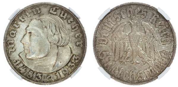 Germany, Third Reich. Martin Luther AR 5 Marks. 1933D.