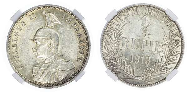German East Africa. Wilhelm II AR 1/4 Rupie. 1913J. GUILELMUS II IMPERATOR, helmetted bust left / DEUTSCH OSTAFRIKA, Wreaths. Value, date and mint mark, within. KM 8. 2.92g, 19.20mm, 12h.