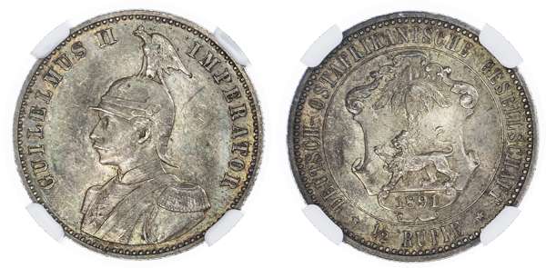 German East Africa. Wilhelm II AR 1/2 Rupie. 1891. GUILELMUS II IMPERATOR, helmetted bust left / DEUTSCH - OSTAFRIKANISCHE GESELLSCHAFT, ✶1/2 RUPIE✶ date in cartouche below Coat of Arms. KM 4. 5.83g, 25mm, 11h.