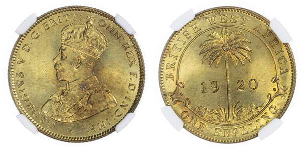 British West Africa. George V BR Shilling. 1920 KN. · GEORGIVS V D.G.BRITT: OMN:REX F.D.IND:IMP: dot below bust left / BRITISH WEST AFRICA, ONE SHILLING, date centre divided by Palm Tree. KM 12. 5.655g, 23.60mm, 12h.