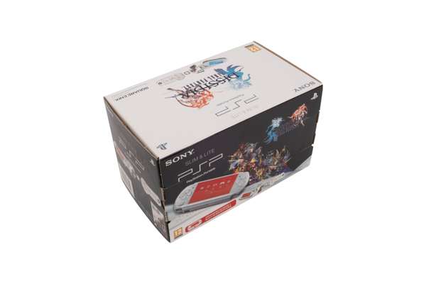This lot contains a boxed Sony PlayStation Portable (PSP) Slim & Lite edition with Final Fantasy Dissidia. The console is boxed and unused. The item comes from the inventory of a former games store manager.