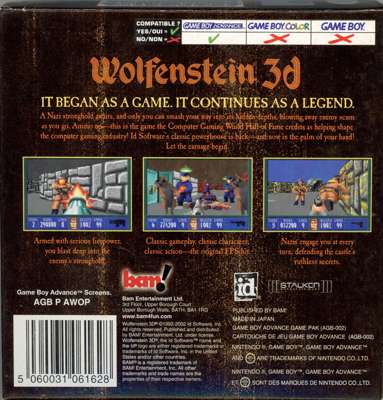 This lot contains a complete in box copy of Wolfenstein 3D for the Nintendo GBA. This game is for the PAL region/territory. The game/box in brand new and in excellent condition.