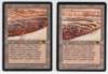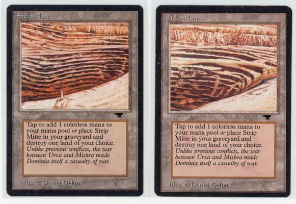 This lot features x2 copies of Strip Mine from Antiquities, with the A artwork variant in Excellent condition, and the C artwork variant in Light Play condition.