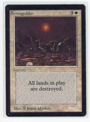 This Armageddon from Beta initially presents as an Excellent copy, however several inked spots on the card's border make this a Poor copy in accordance with Magic Cardmarket's guidelines.