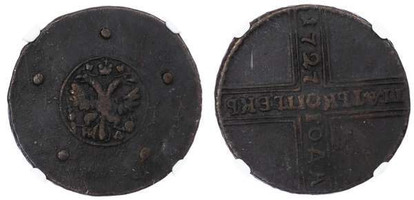 Russia, Empire. Catherine I CU 5 Kopeck. Naberezhny mint, 1727. Crowned double-headed eagle facing, holding sceptre and orb; crown above, H-Д across lower fields; all within dotted circular border, five pellets (mark of value) around; all within border / Denomination and date within cross. Bitkin -, cf. 272-288. 19.53g.